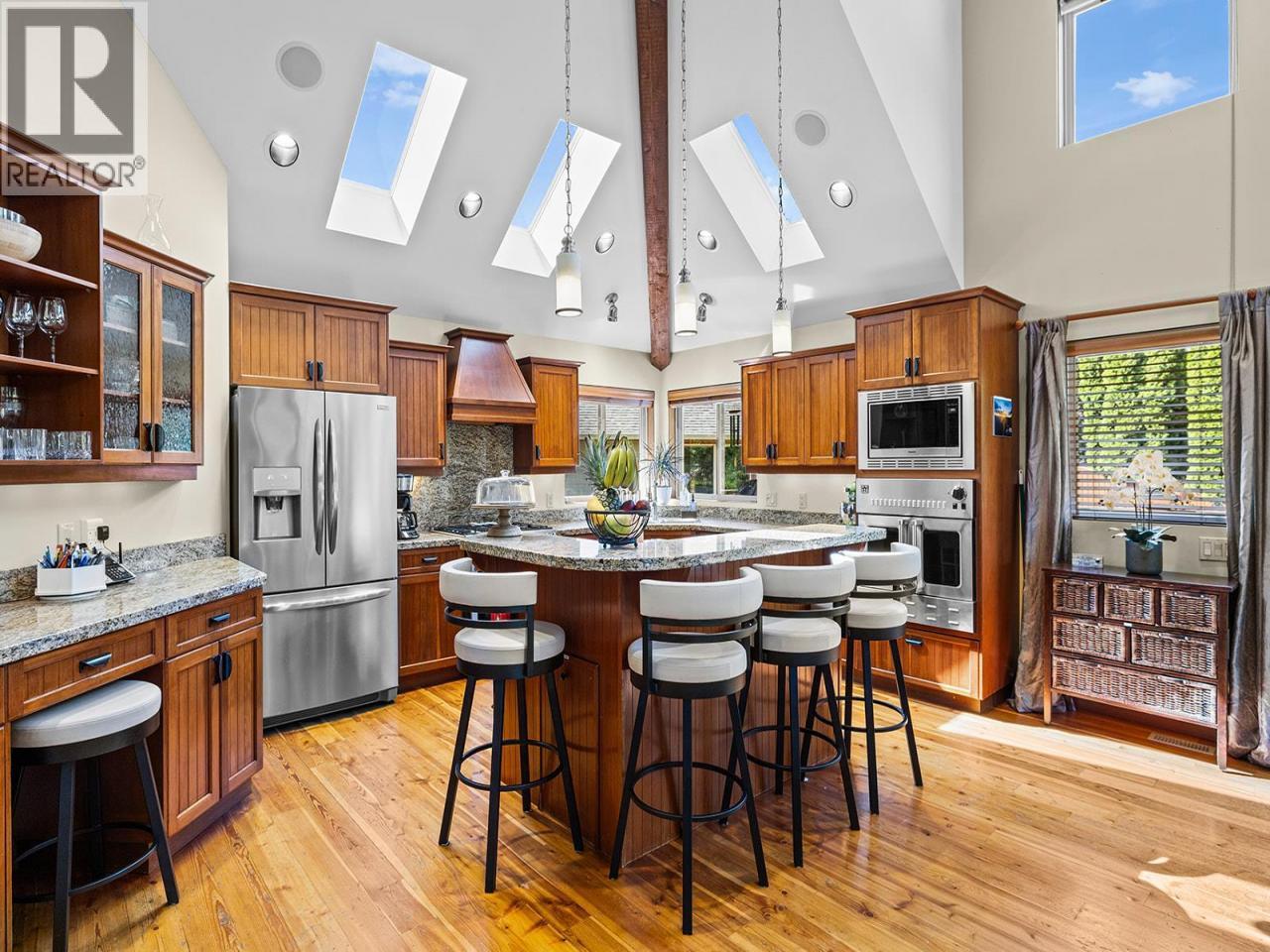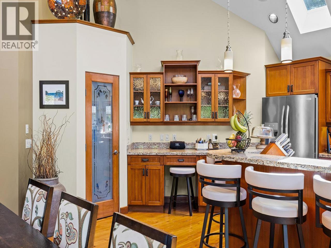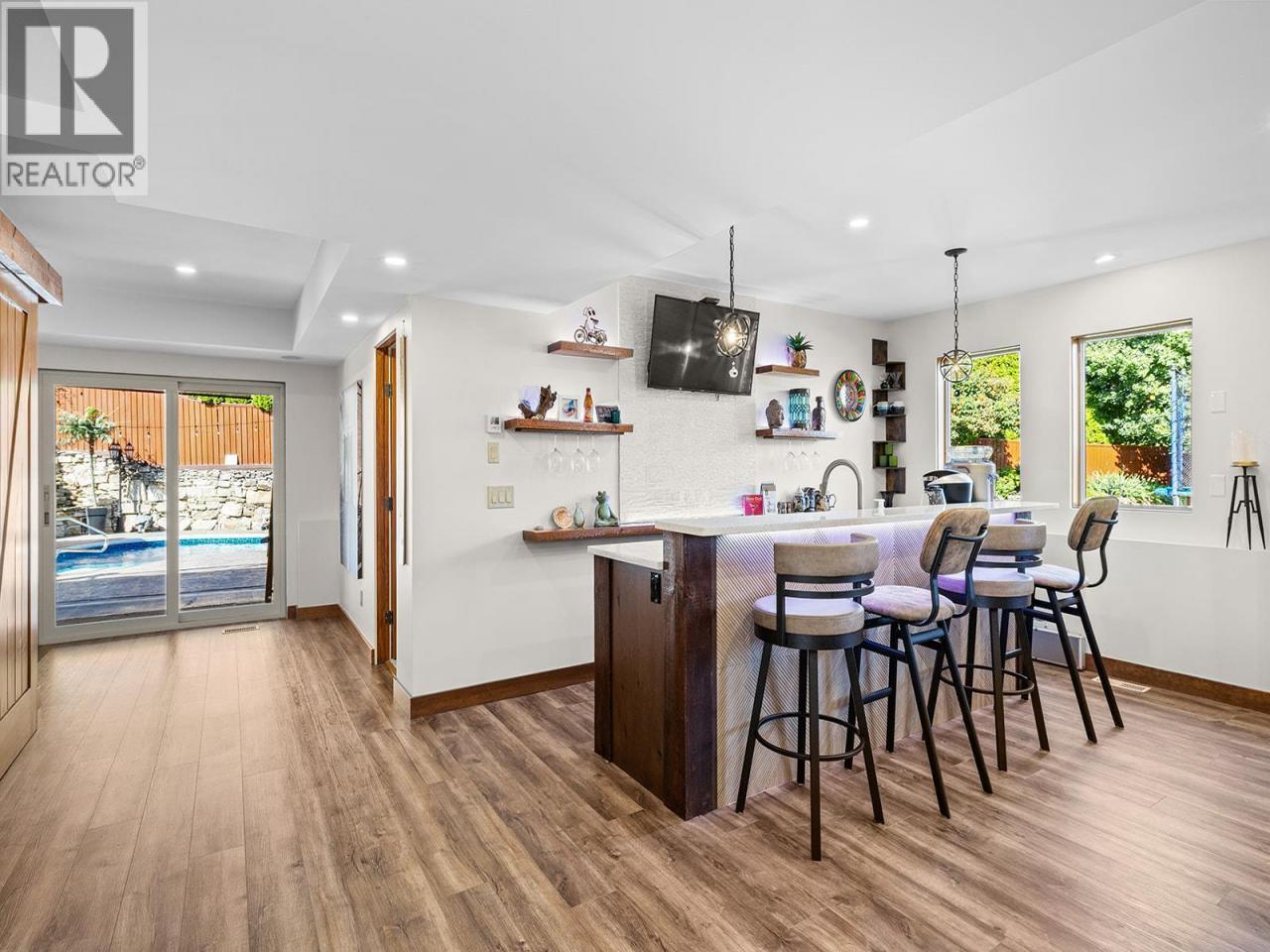 Experience true Okanagan living in Crawford Estates with your own private pool paradise. Featuring brand NEW roofs on both the main home and detached garage, this 6-bedroom, 6-bathroom home seamlessly blends timeless craftsmanship with modern comfort on a private, beautifully landscaped 0.4-acre lot. The striking exterior showcases timber and stone accents with dramatic rooflines that set the tone for the elegance within. Step inside to soaring vaulted ceilings, oversized windows, and a bright, open-concept design that fills the home with natural light. The chef-inspired granite kitchen features built-in appliances, a massive island, and abundant storage perfect for everyday living and entertaining. The spa-like primary suite offers a jetted tub, luxurious finishes, and tranquil views of the surrounding landscape. The walkout basement is an entertainer’s dream, complete with a custom bar, media lounge, and direct access to your private backyard oasis featuring a heated saltwater pool, hot tub, rock waterfall, and lush gardens. A detached, heated two-level garage/workshop adds versatility with its own bathroom, sauna, and wine cellar, ideal for hobbies, guests, or additional living space. With four covered parking spots, RV space, and ample room for family and visitors, this home perfectly balances function and sophistication. Nestled in one of Kelowna’s most desirable neighborhoods, Crawford Estates is known for its proximity to parks, trails, and top-rated schools. (id:6769)
