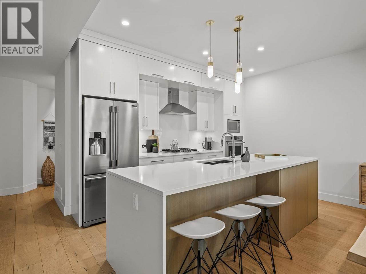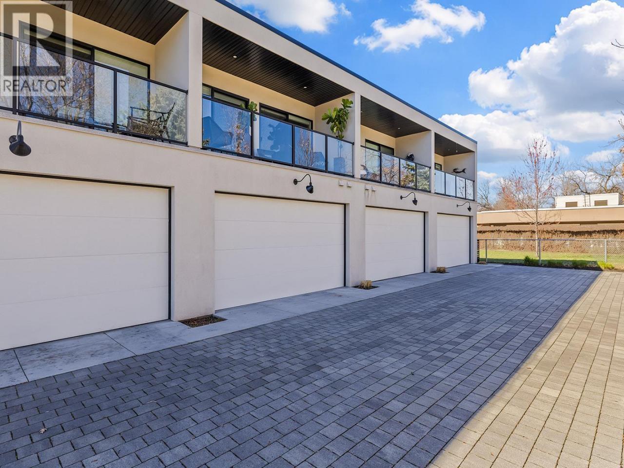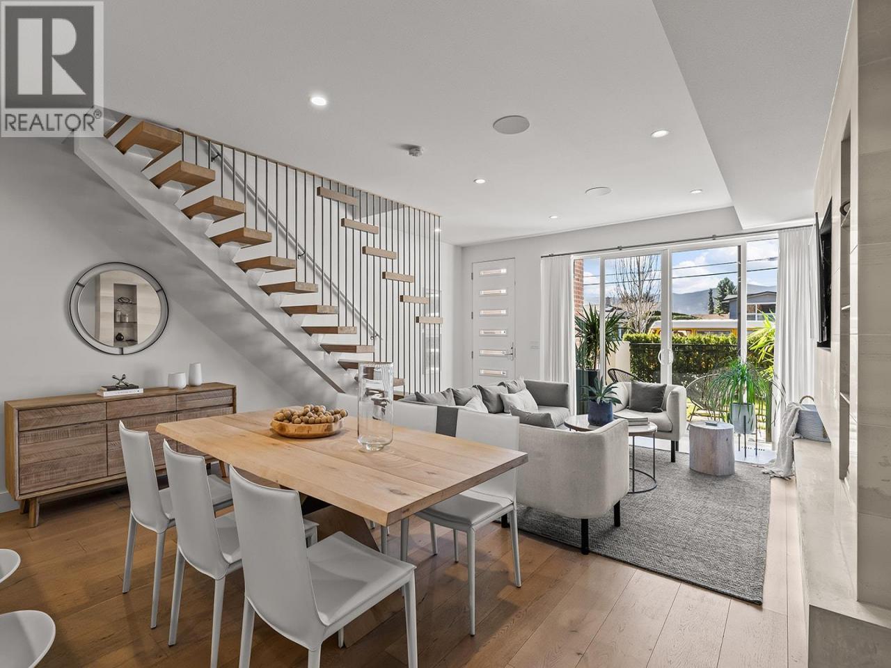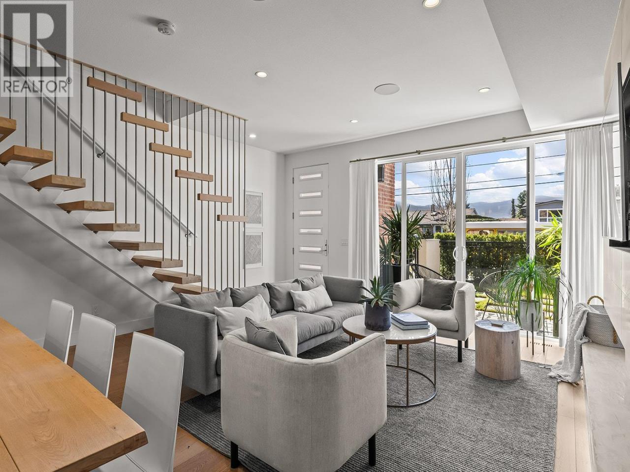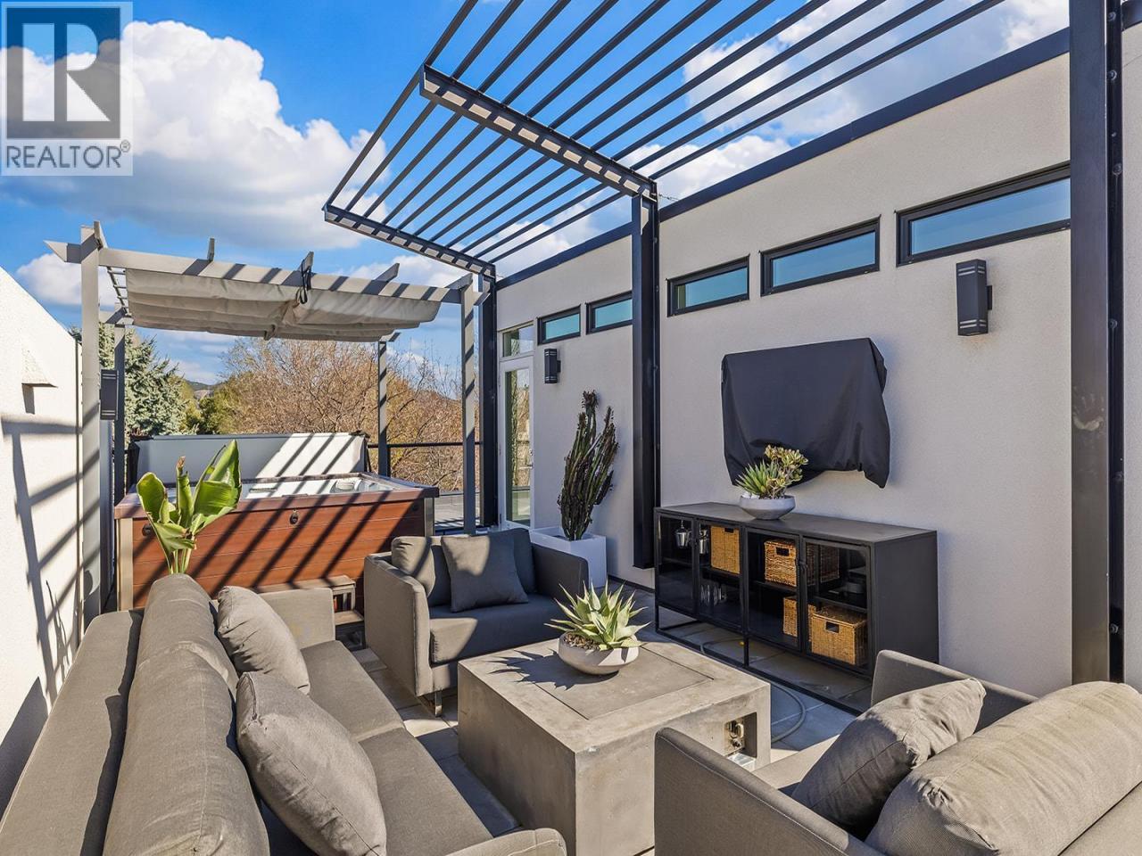 Welcome to this contemporary, modern townhome offering an exceptional lifestyle and is perfectly situated. This property features three bedrooms and three bathrooms with 1914 square feet of bright, open interior living space and an additional 452 square feet of private outdoor space. The main floor boasts a grand level entry and an open-concept layout, ideal for entertaining. The kitchen is fully equipped with stainless steel appliances and features flat-panel cabinets and premium quartz countertops, which are featured throughout the home. The second level is thoughtfully designed for comfort and convenience, housing all three bedrooms, a lounge/family room, and laundry space. The luxurious primary suite includes a walk-in closet and a five-piece ensuite bathroom with a modern glass shower and a soaker tub. The two additional bedrooms are ideal for family or guests and share a full bathroom equipped with a double vanity. They also have their own patio doors leading to a private, quiet covered deck. One of the standout features of this property is the extensive outdoor space: a front patio, a private rooftop patio and covered deck off the spare bedrooms making it perfect for exceptional outdoor entertaining, enjoying Okanagan evenings and mountain views. If you need space for your toys and storage, this home features an attached double garage and an easily accessible crawl space for extra storage. Ideally located, this sought-after neighborhood is perfect for walking or biking to local amenities, including beaches, parks, shopping, transit, and Downtown Kelowna. Pets are allowed with restrictions. (id:6769)