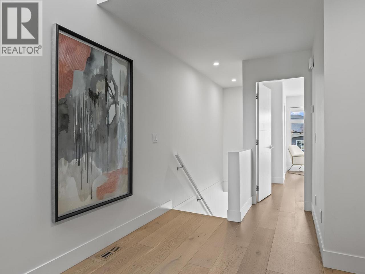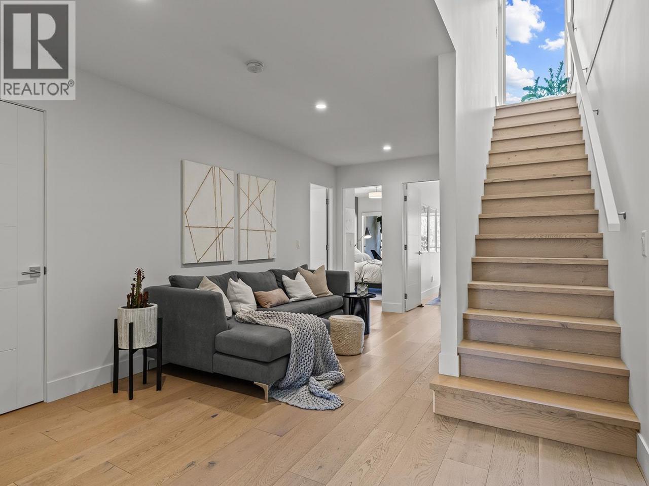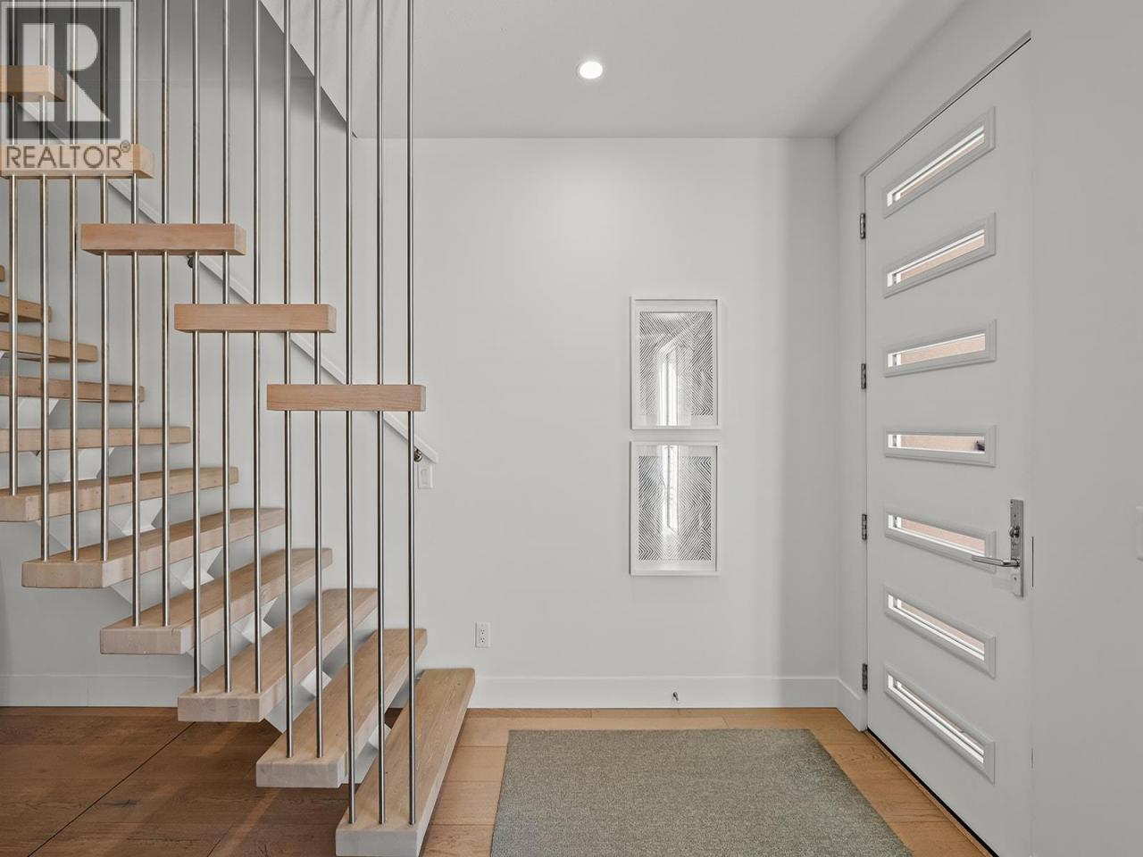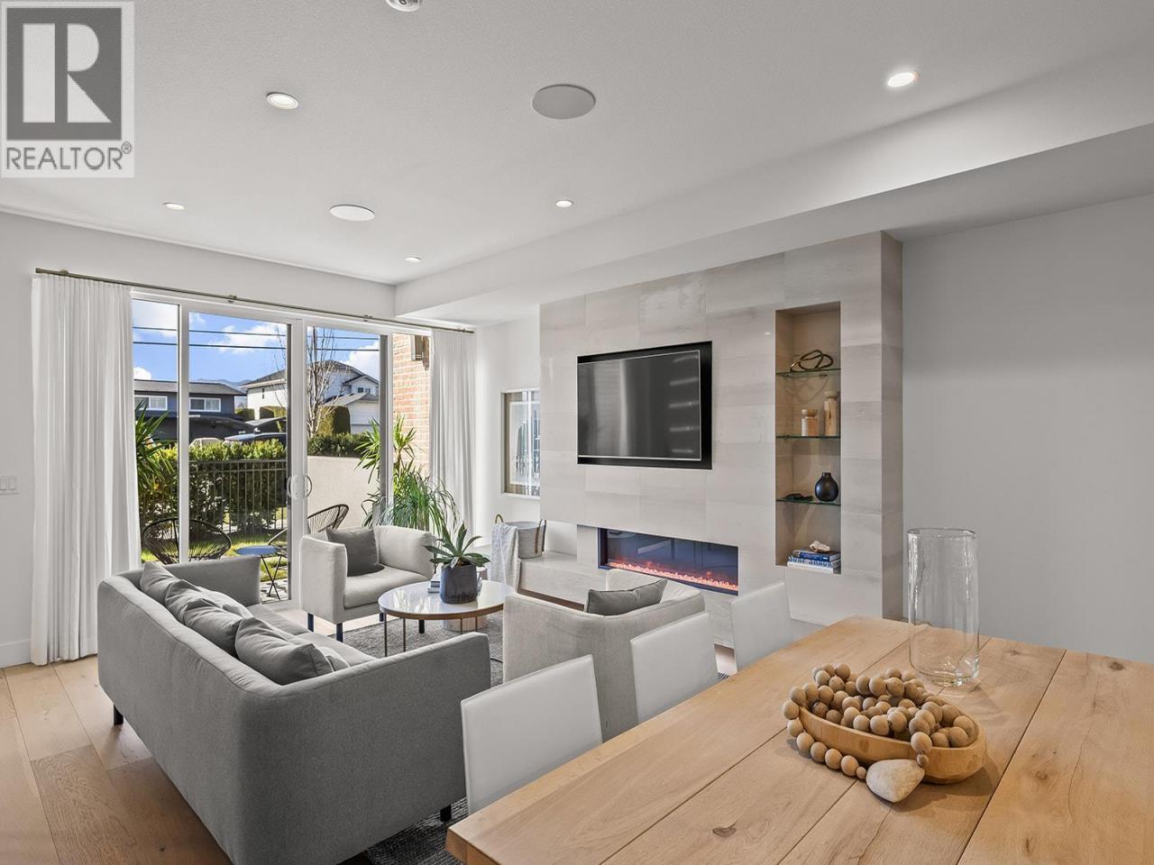 Welcome to this contemporary, modern townhome offering an exceptional lifestyle and is perfectly situated. This property features three bedrooms and three bathrooms with 1914 square feet of bright, open interior living space and an additional 452 square feet of private outdoor space. The main floor boasts a grand level entry and an open-concept layout, ideal for entertaining. The kitchen is fully equipped with stainless steel appliances and features flat-panel cabinets and premium quartz countertops, which are featured throughout the home. The second level is thoughtfully designed for comfort and convenience, housing all three bedrooms, a lounge/family room, and laundry space. The luxurious primary suite includes a walk-in closet and a five-piece ensuite bathroom with a modern glass shower and a soaker tub. The two additional bedrooms are ideal for family or guests and share a full bathroom equipped with a double vanity. They also have their own patio doors leading to a private, quiet covered deck. One of the standout features of this property is the extensive outdoor space: a front patio, a private rooftop patio and covered deck off the spare bedrooms making it perfect for exceptional outdoor entertaining, enjoying Okanagan evenings and mountain views. If you need space for your toys and storage, this home features an attached double garage and an easily accessible crawl space for extra storage. Ideally located, this sought-after neighborhood is perfect for walking or biking to local amenities, including beaches, parks, shopping, transit, and Downtown Kelowna. Pets are allowed with restrictions. (id:6769)