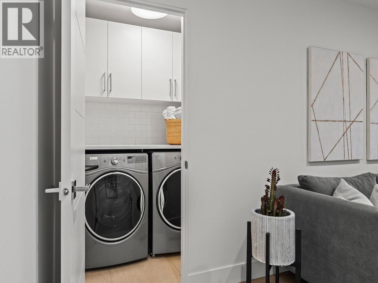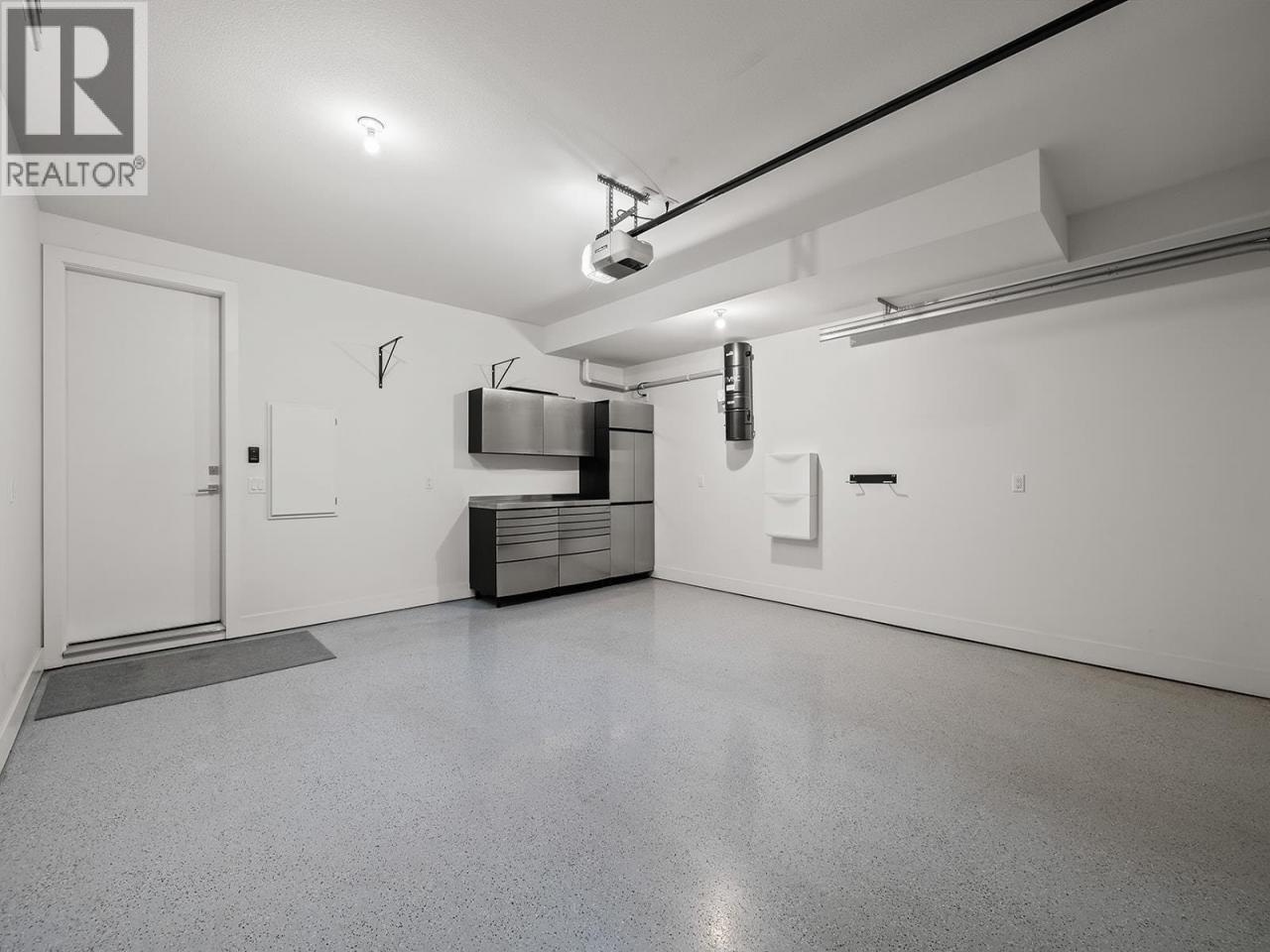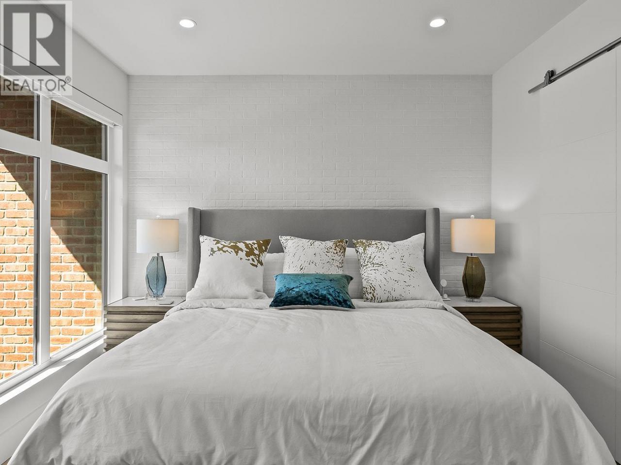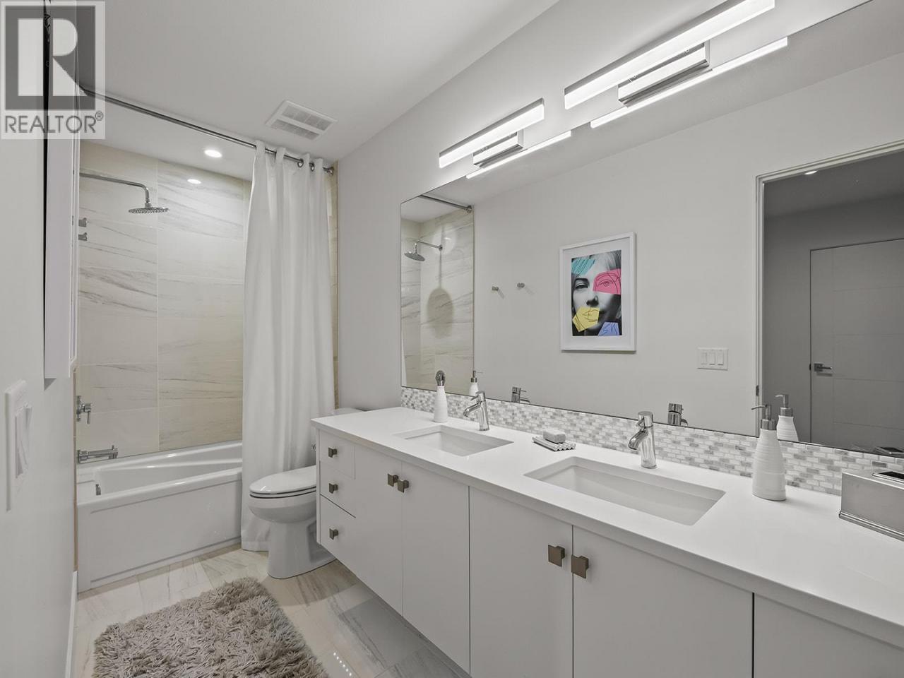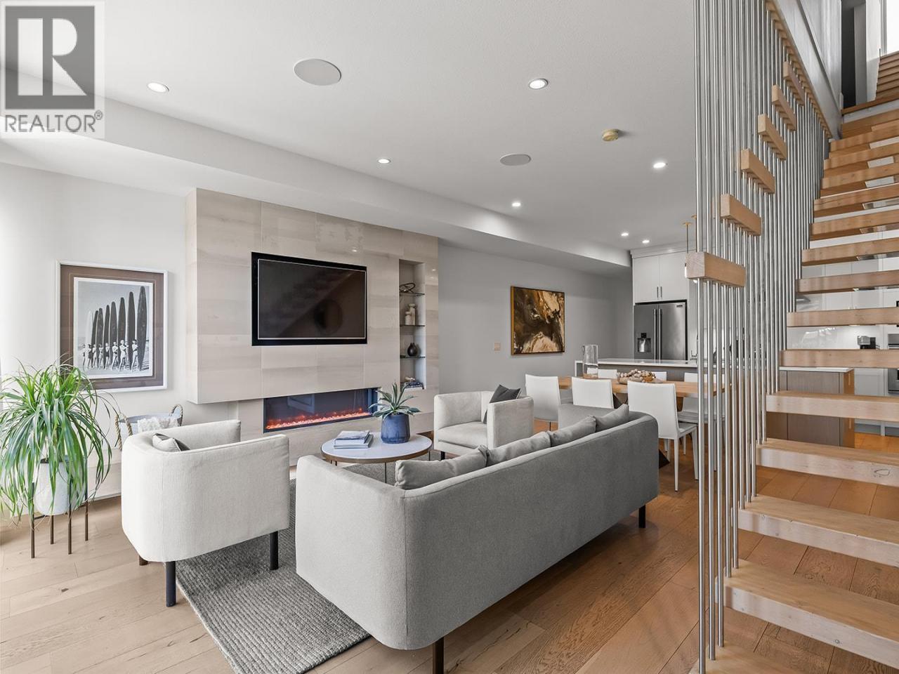 Welcome to this contemporary, modern townhome offering an exceptional lifestyle and is perfectly situated. This property features three bedrooms and three bathrooms with 1914 square feet of bright, open interior living space and an additional 452 square feet of private outdoor space. The main floor boasts a grand level entry and an open-concept layout, ideal for entertaining. The kitchen is fully equipped with stainless steel appliances and features flat-panel cabinets and premium quartz countertops, which are featured throughout the home. The second level is thoughtfully designed for comfort and convenience, housing all three bedrooms, a lounge/family room, and laundry space. The luxurious primary suite includes a walk-in closet and a five-piece ensuite bathroom with a modern glass shower and a soaker tub. The two additional bedrooms are ideal for family or guests and share a full bathroom equipped with a double vanity. They also have their own patio doors leading to a private, quiet covered deck. One of the standout features of this property is the extensive outdoor space: a front patio, a private rooftop patio and covered deck off the spare bedrooms making it perfect for exceptional outdoor entertaining, enjoying Okanagan evenings and mountain views. If you need space for your toys and storage, this home features an attached double garage and an easily accessible crawl space for extra storage. Ideally located, this sought-after neighborhood is perfect for walking or biking to local amenities, including beaches, parks, shopping, transit, and Downtown Kelowna. Pets are allowed with restrictions. (id:6769)