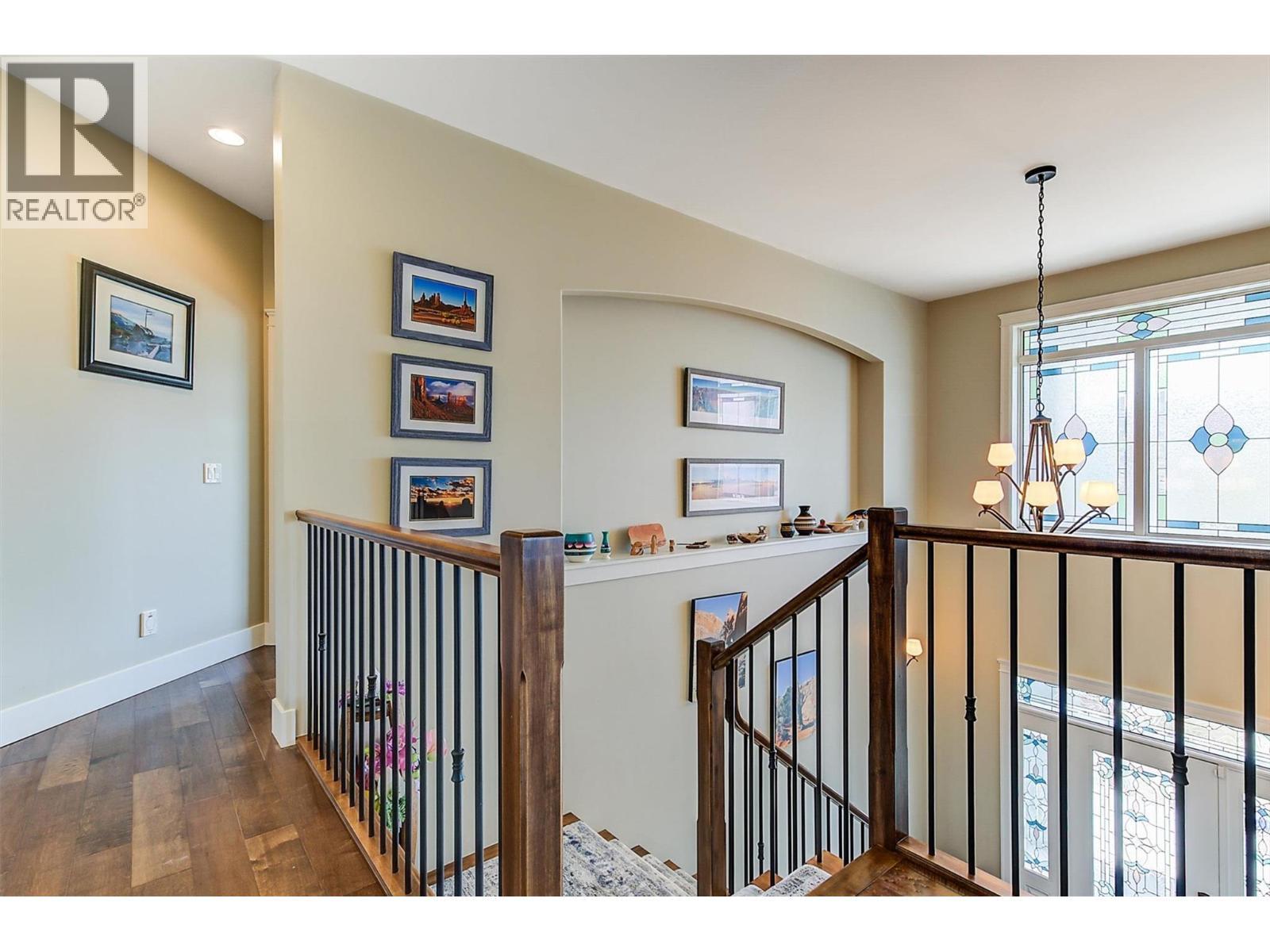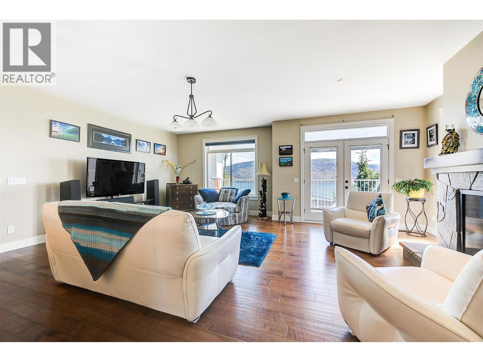 Perched to capture panoramic lake views from every level, this impressive 2011 custom-built home offers 2,447 sq. ft. of refined living space and exceptional craftsmanship throughout. A dramatic 20-foot grand entry welcomes you inside, where sunlight filters through authentic leaded glass windows. The upper level features an open-concept design with living and dining areas centered around a custom kitchen complete with a large island, gas range, and built-in wine fridge. An oversized stone gas fireplace anchors the living room, while French doors open to a covered patio surrounded by professional landscaping and uninterrupted lake views. The patio connects to a private gazebo with hot tub, perfect for relaxing and entertaining. The spa-inspired ensuite includes a glass shower, custom cabinetry, corner soaker tub, and private water closet, along with a spacious walk-in closet and laundry chute. Downstairs offers three generously sized bedrooms — each with lake views — and a full bathroom, ideal for family or guests. Additional highlights include a spacious garage with workbench and storage, custom paver stone driveway, striking stone exterior, and a six-zone irrigation system protecting the beautifully maintained landscaping. Enjoy morning sun from one of three front decks and evening sunsets from the hot tub. Located in sought-after Peachland, this exceptional home is just minutes from waterfront shops, dining, and small-town charm. Make your appointment today. (id:6769)